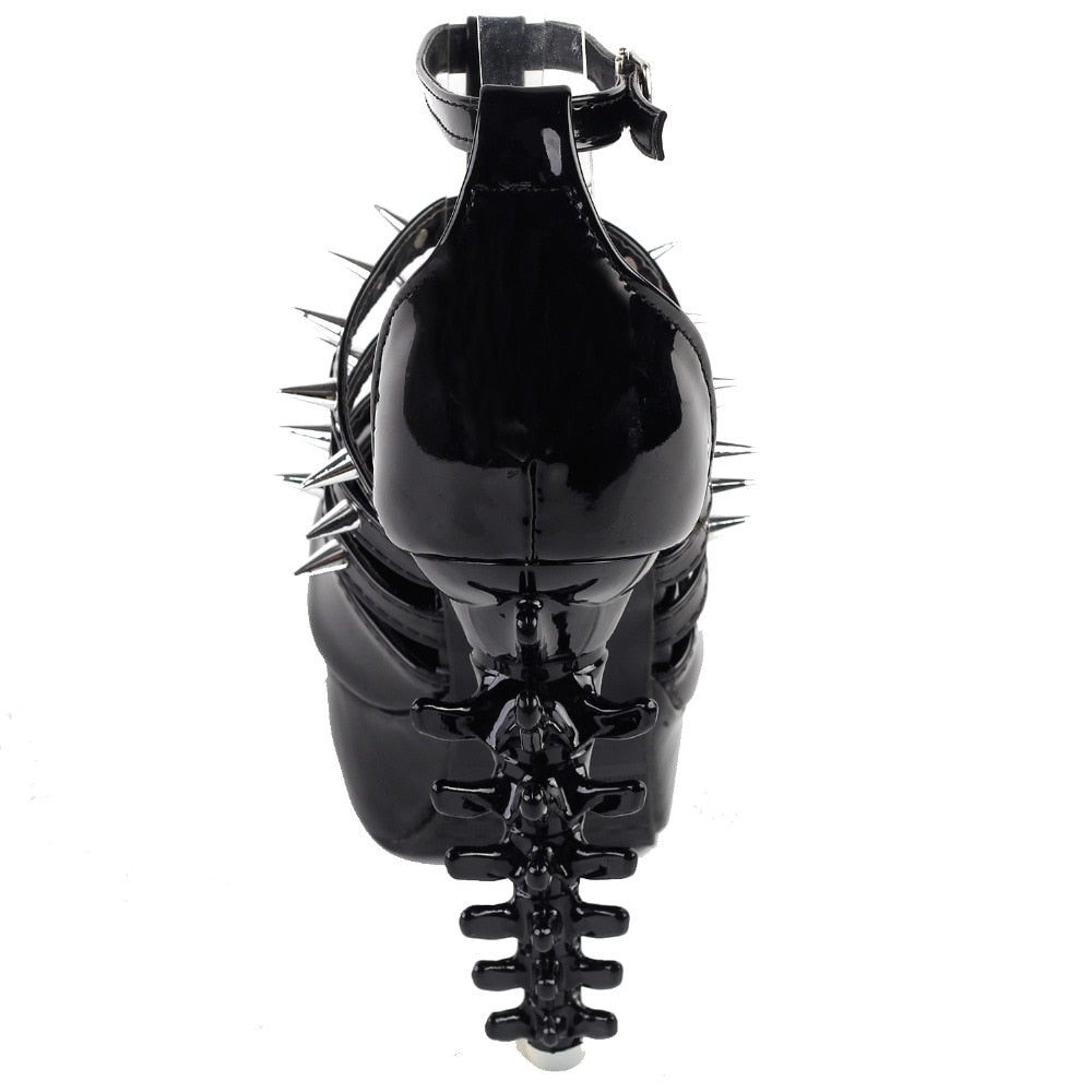 The coolest back-bone anatomy-designed heels merged with a Mary-Jane style T-Strap round-toe shoe. To add to the goth-punk vibes, the three straps have big metal spiky studs.