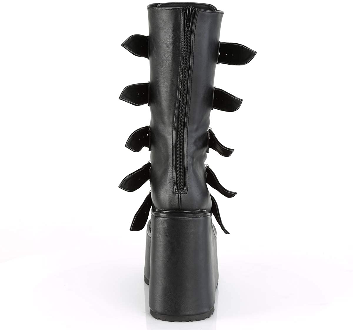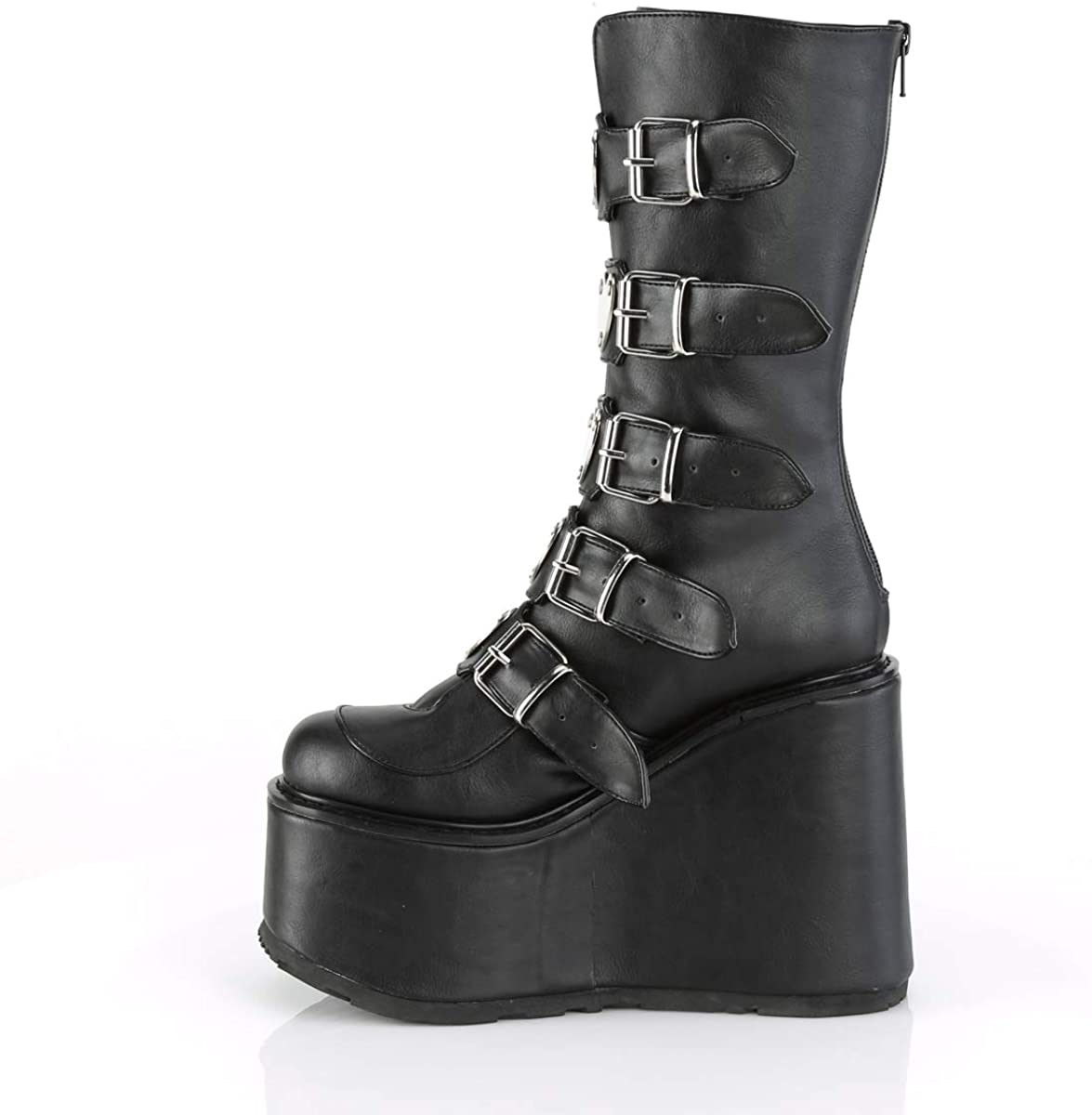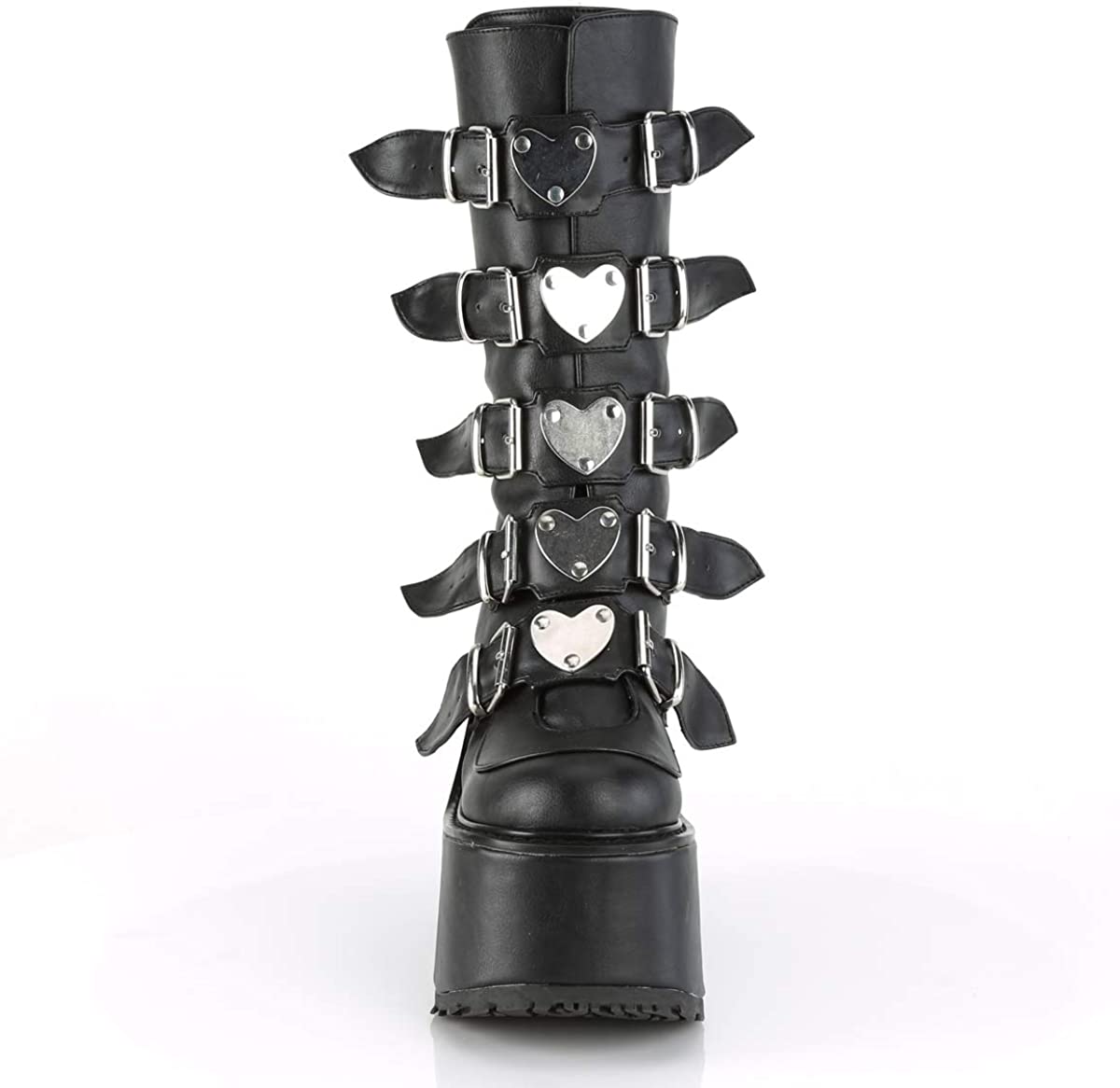 Five industrial-look buckled straps with a metal heart plate line the front, and a thick and comfy big platform sole provide creepy cute vibes.
