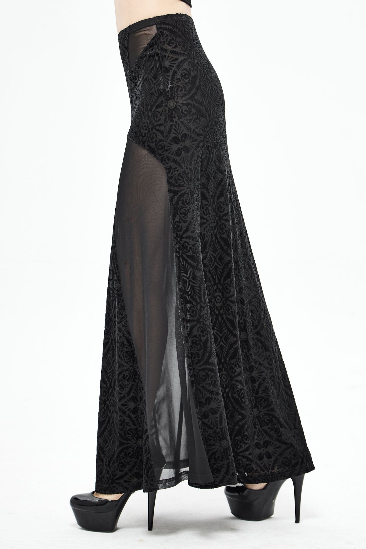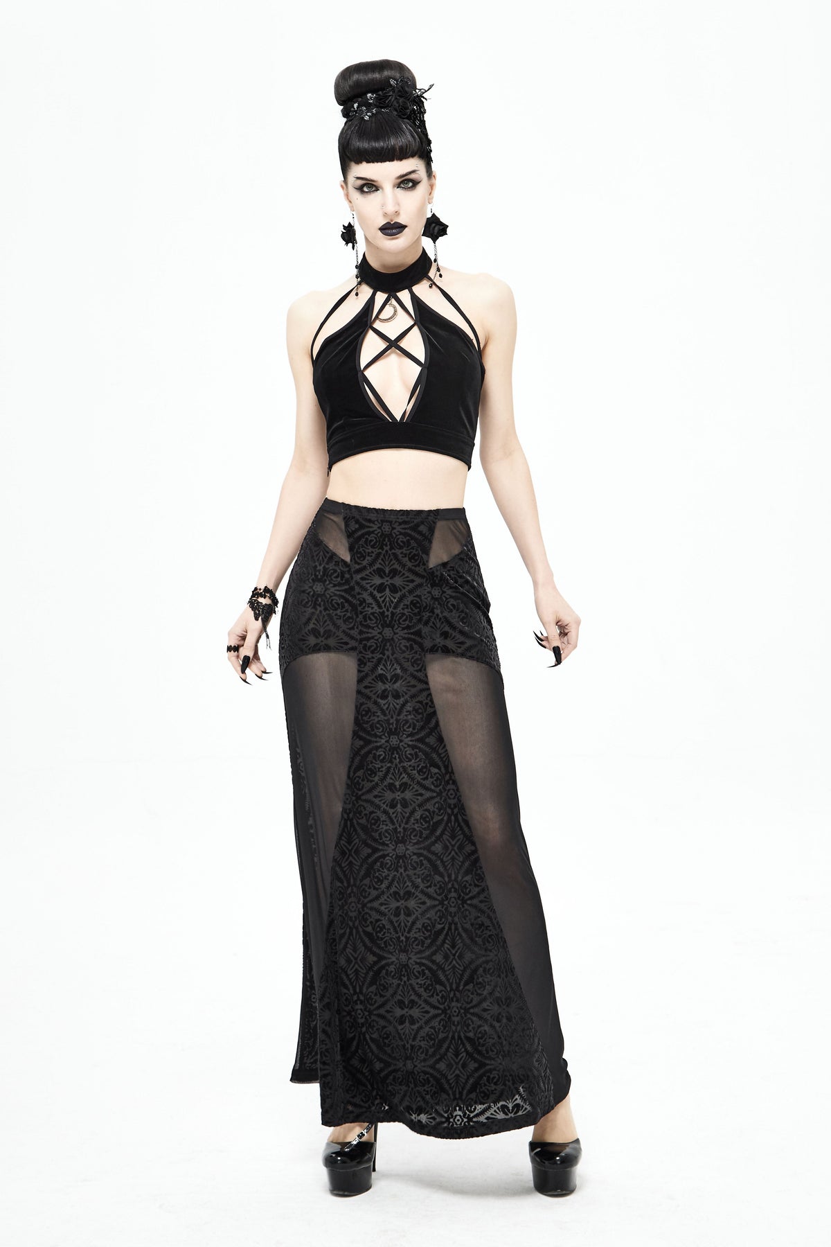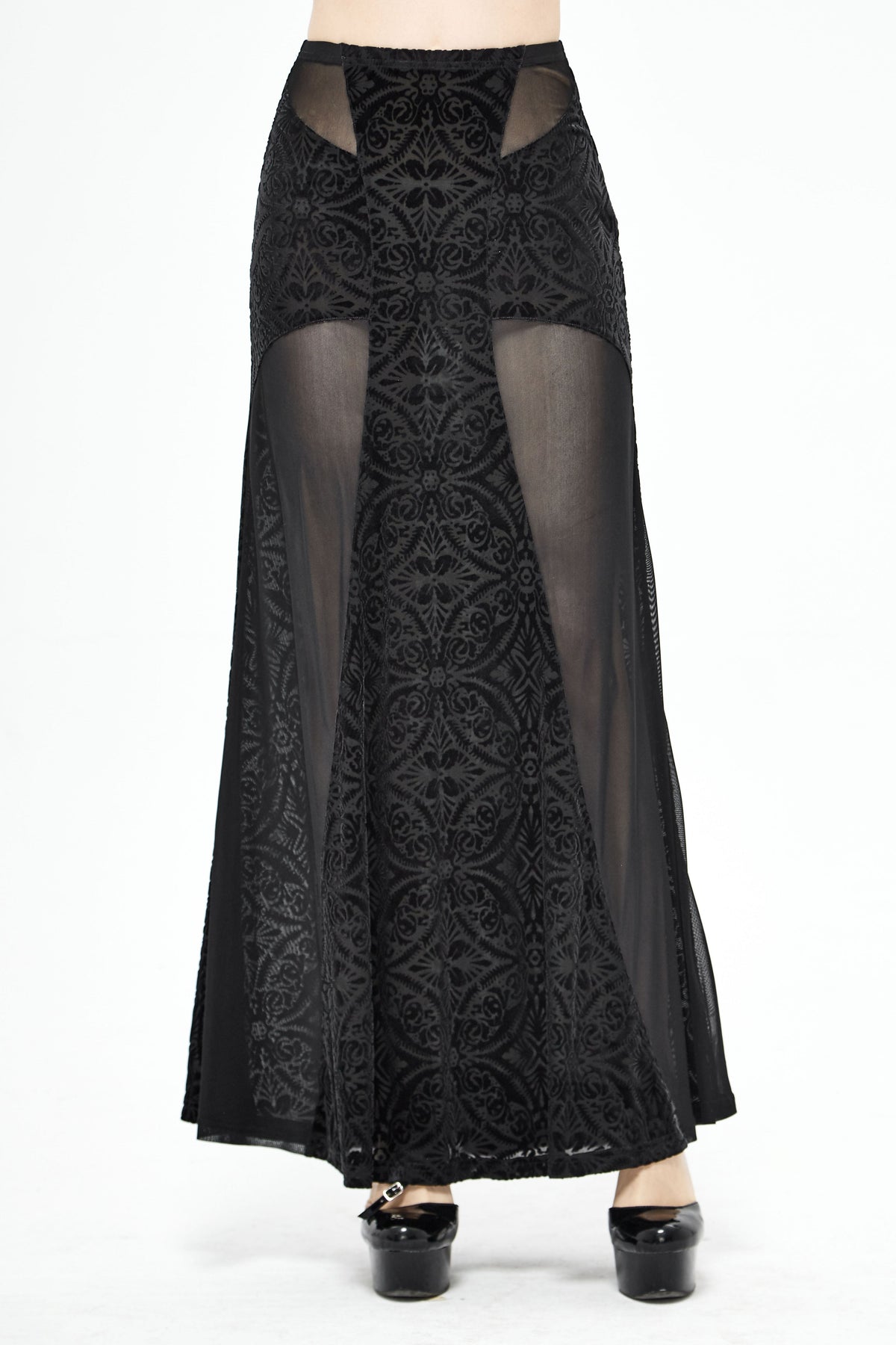 A stunning, fitted maxi skirt with a strategically placed cross design and sheer leg-revealing panels.