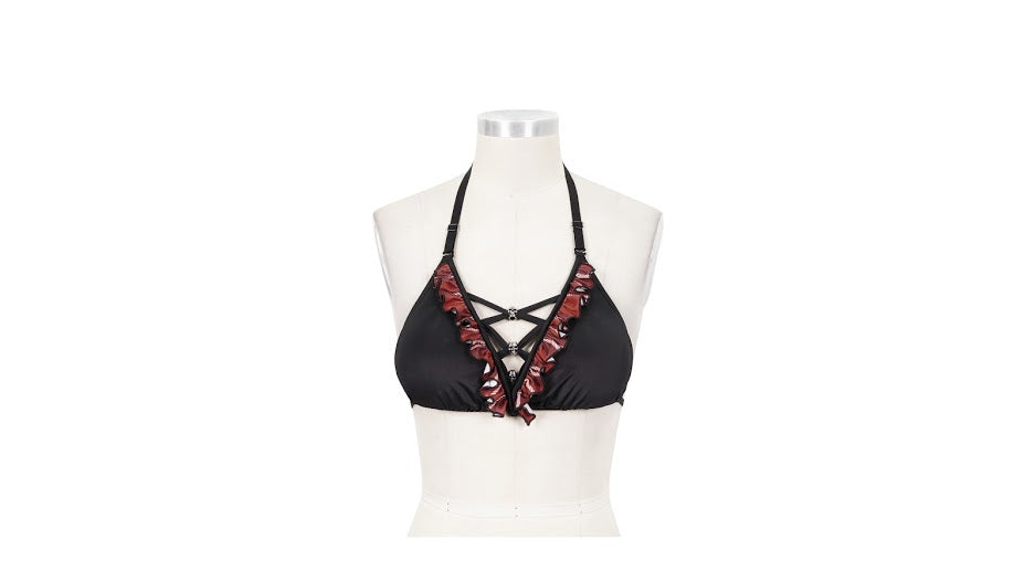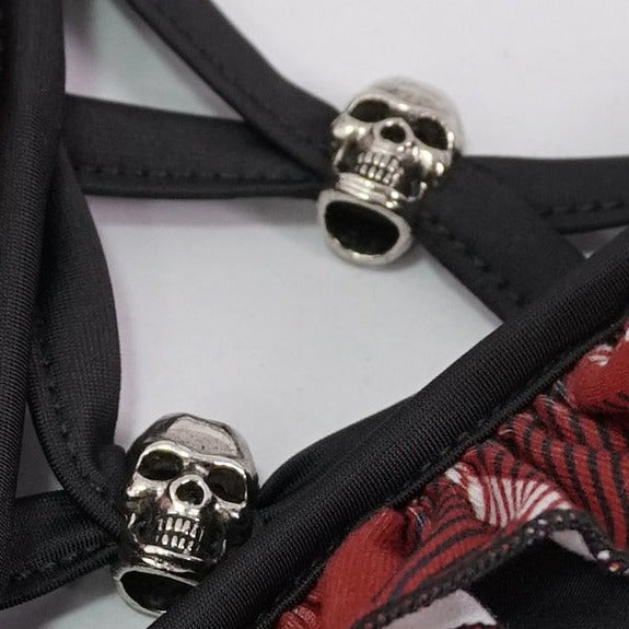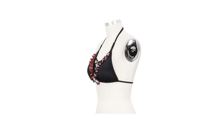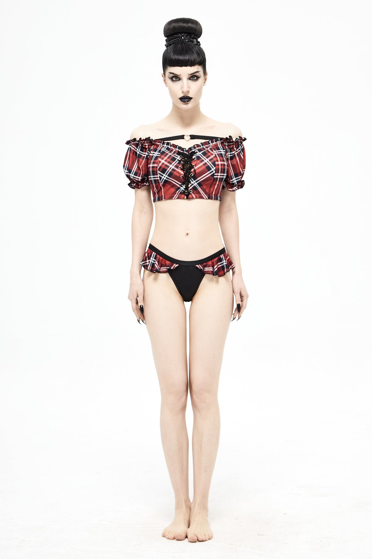 The cutest black bikini bottoms with a plaid ruffle detail and the choice of two plaid themed tops: a triangular top with skull pendants intertwined in a lace up cleavage design, or a cute bandeau off-the-shoulder top with corset front and lace back panel.