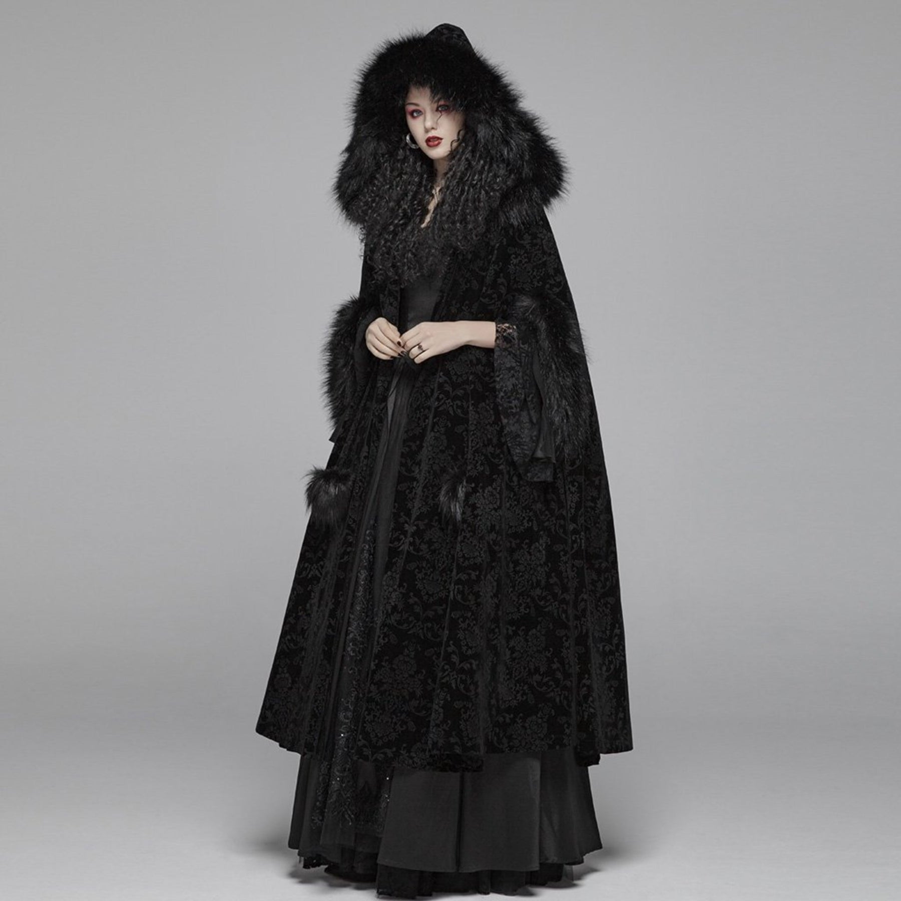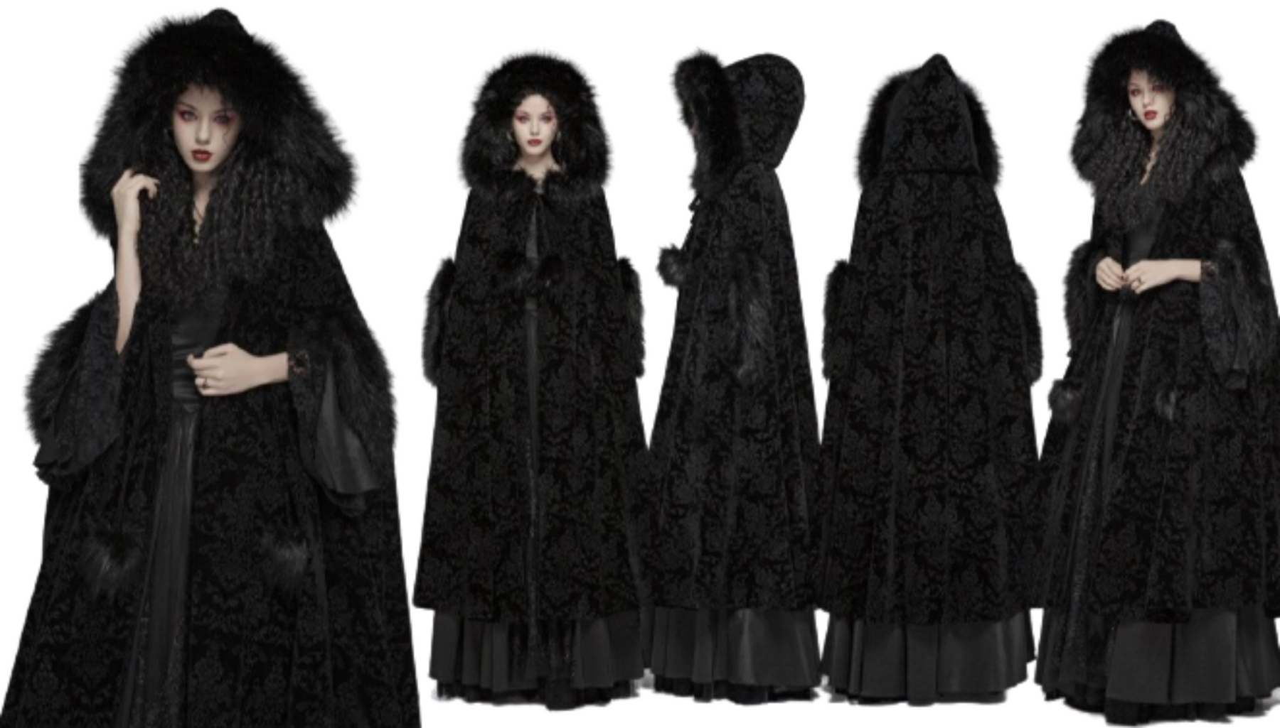 A long, ornately damask-patterned velveteen cloak with an oversized hood and faux fur trims, embodying gorgeous gothic glamour.