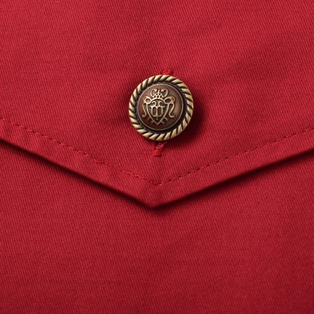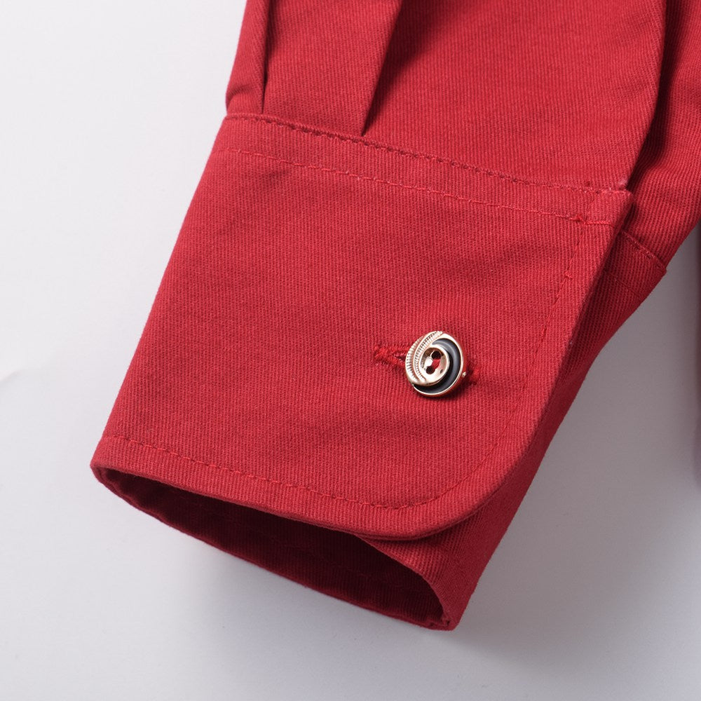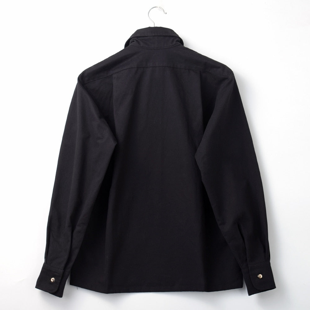 This structured and collared shirt with "bib" style buttoned chest panel and bell sleeves is giving us old west vibes. Ornate buttons on the chest and cuffs provide excellent design details.