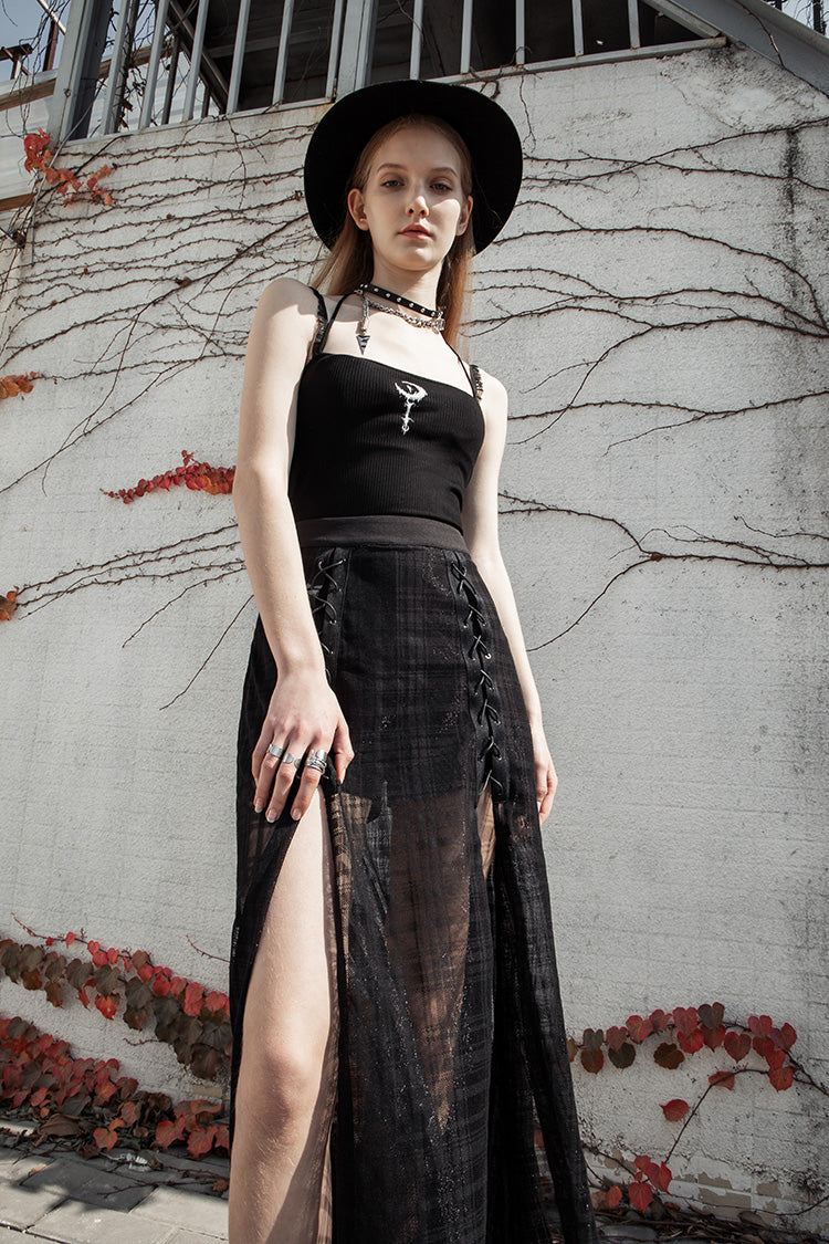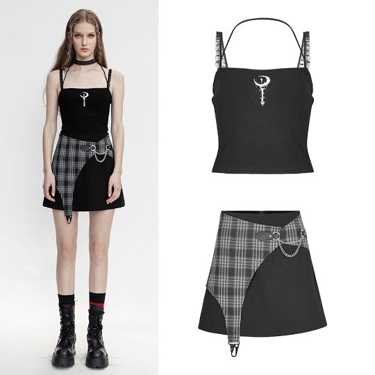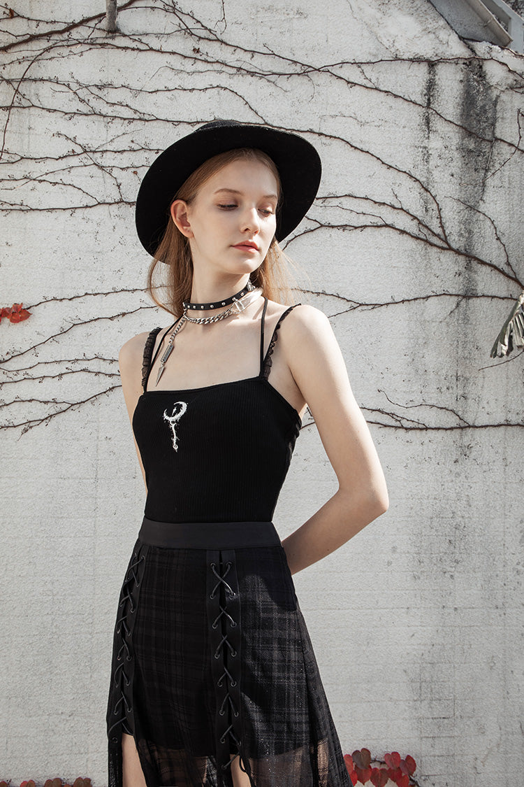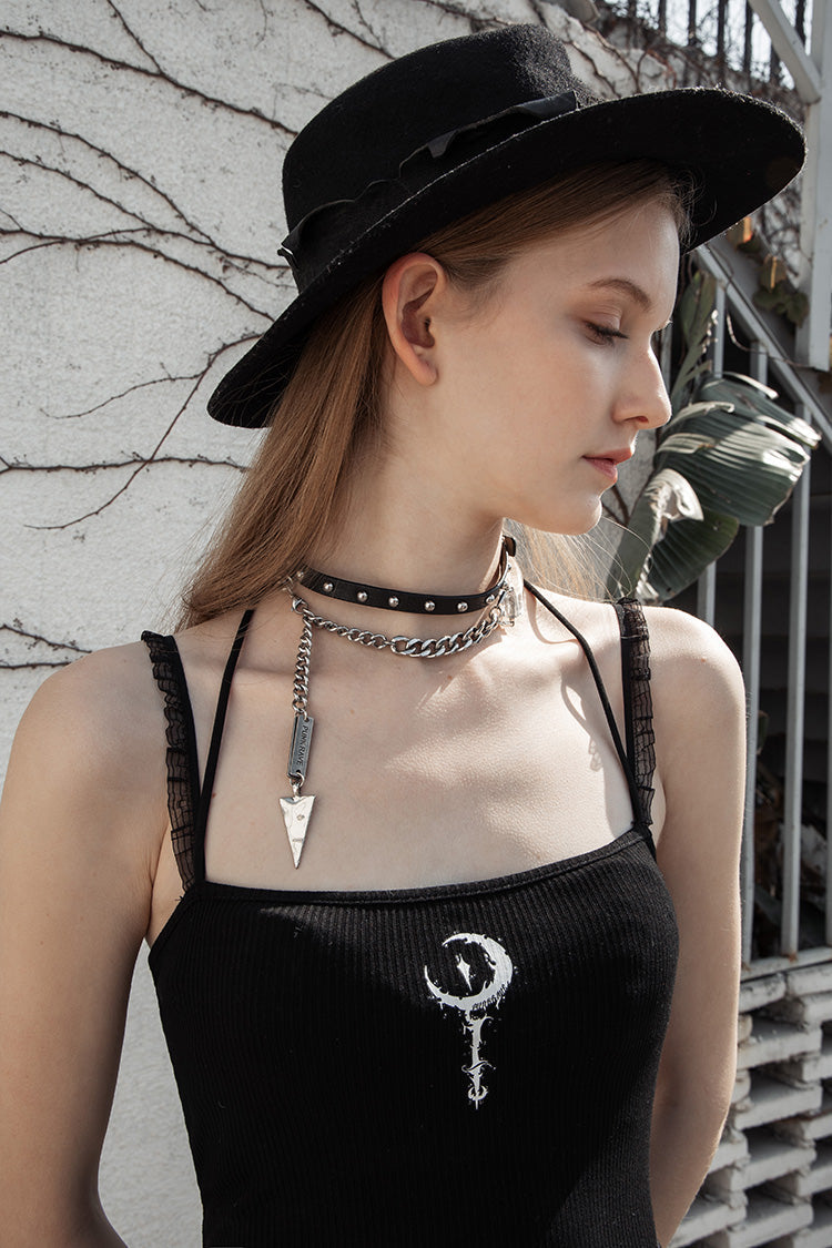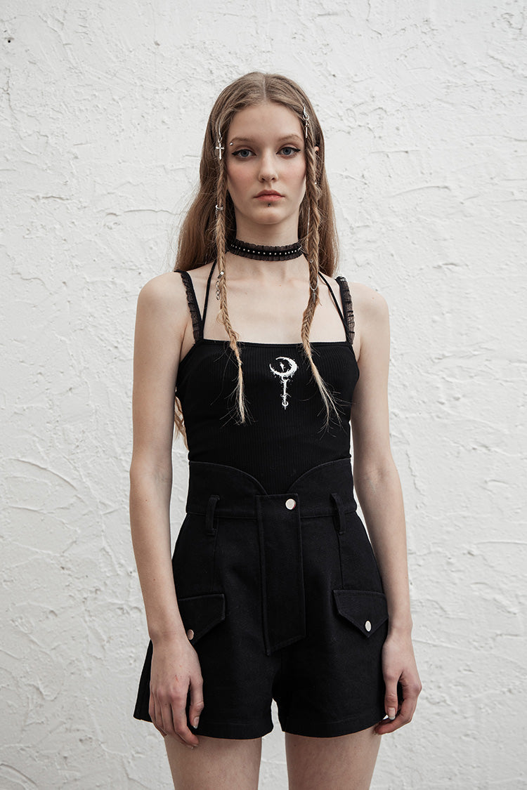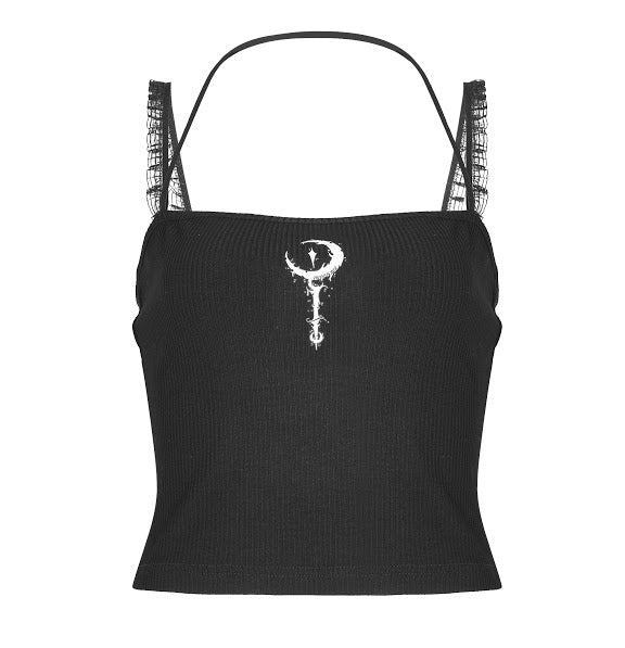 A cute and witchy cropped tank top, with sweet sheer mesh shoulder straps and one back halter strap. The front design features a white crescent moon on a staff.
