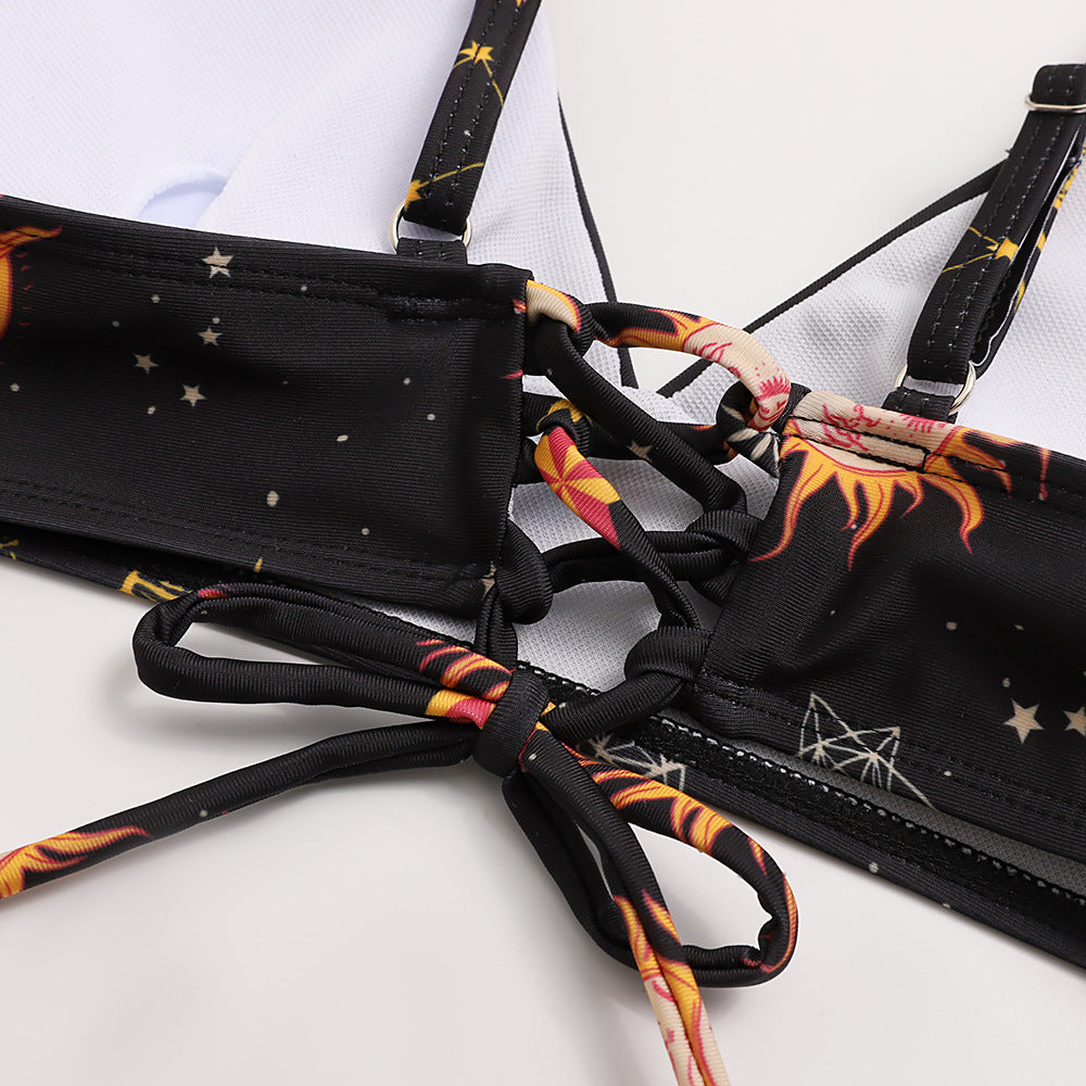 A cute witchy bikini featuring the moon and the stars! A mix of celestial bodies adorn this adorable gothic swimsuit, in a choice of black and white or black with orange pattern.