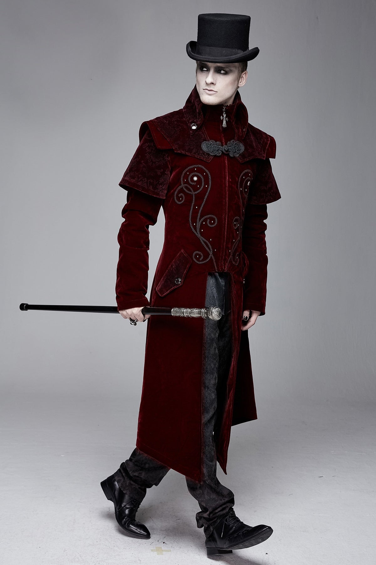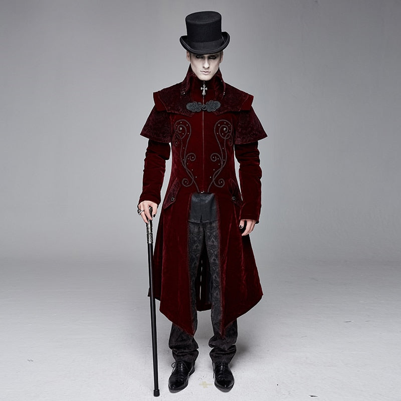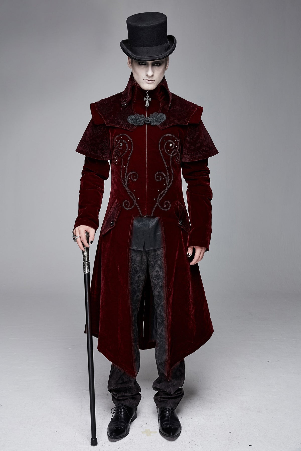 This rich sensual deep wine red color velvet coat has an exquisitely designed structure of varying layers and a mid-calf length. The ornate black embroidery on the front and hems embellishes an already stunning look.