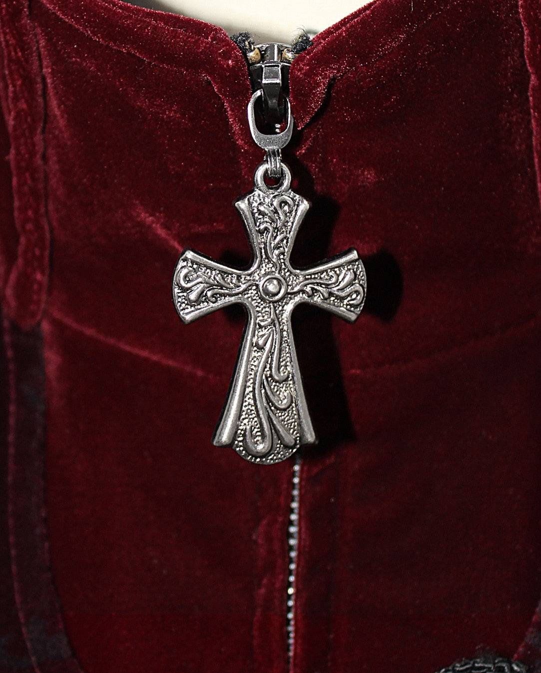 The superb details such as the cross zipper pull, ornate buttons and neck clasp, add to the impact of this unique piece.