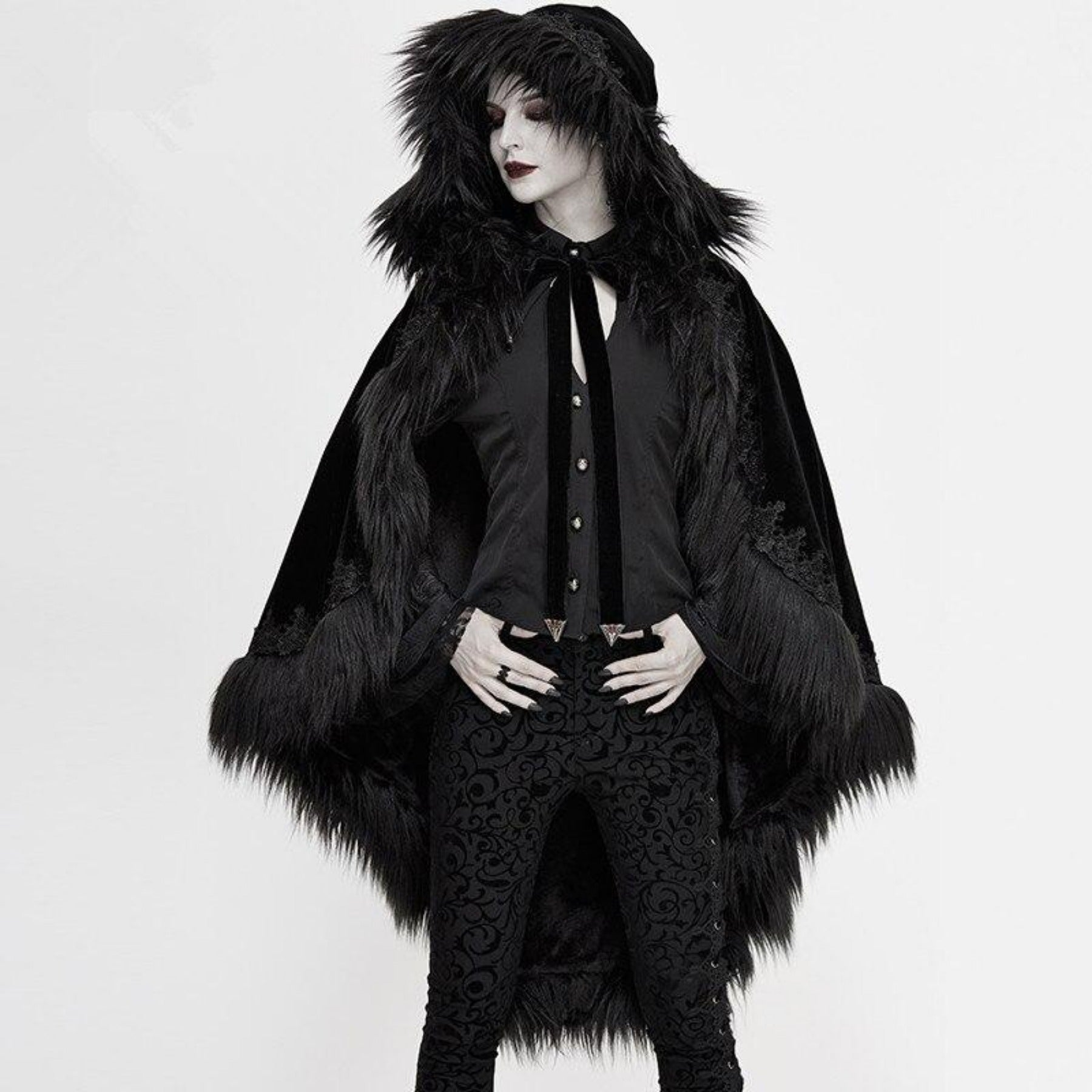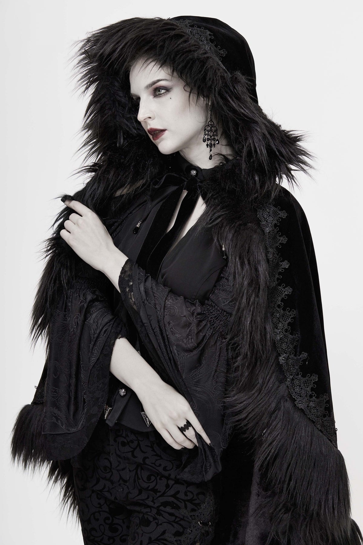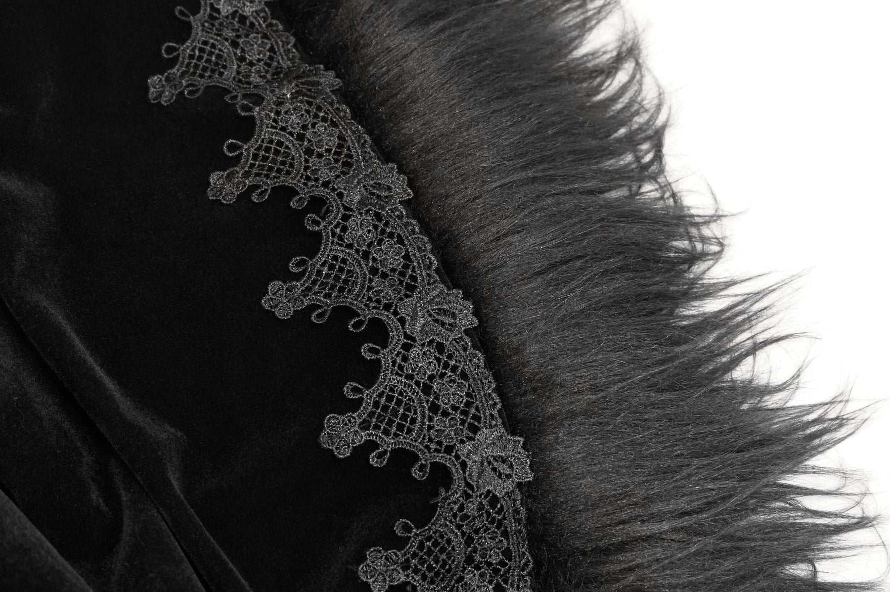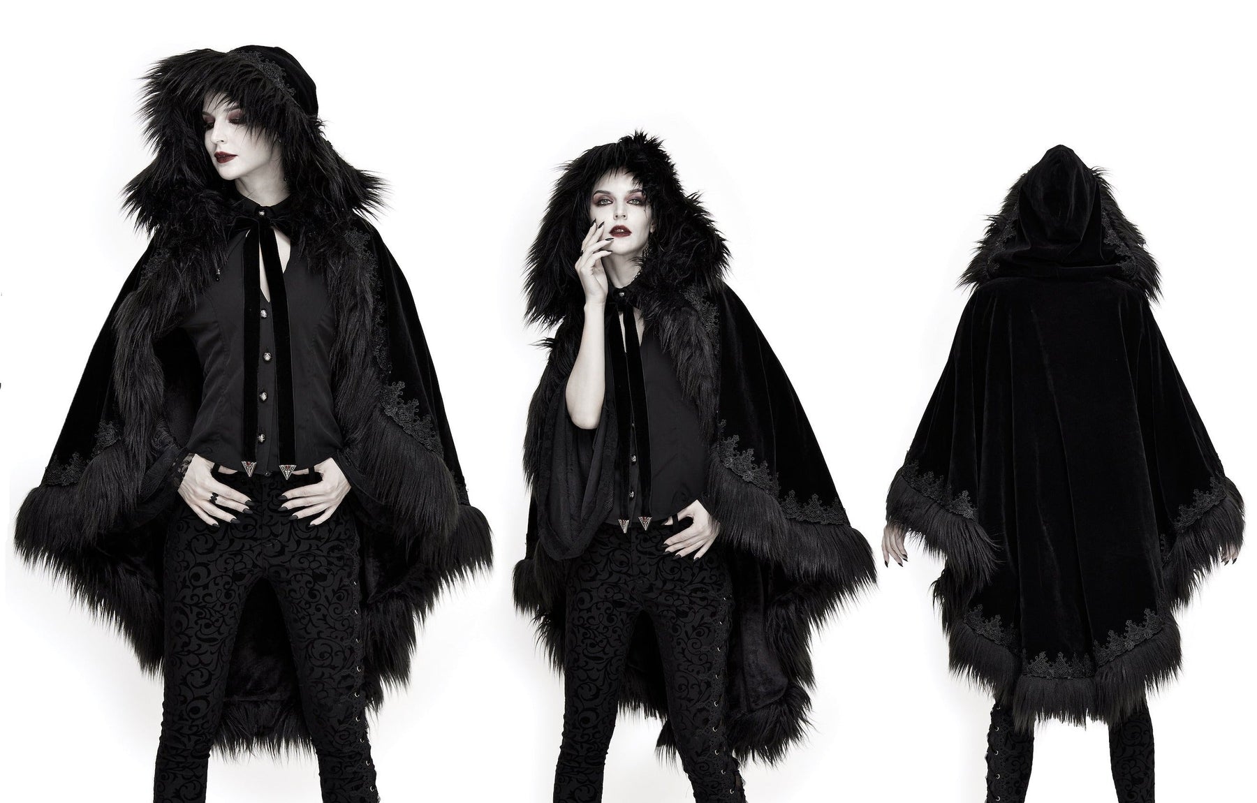 A beautiful, sensually soft velveteen vampire cloak with a faux fur trim and ornate embroidered edges.