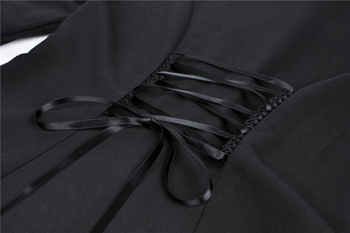 A beautifully cut gothic mini dress with a lace frilled chest panel and high buttoned collar.