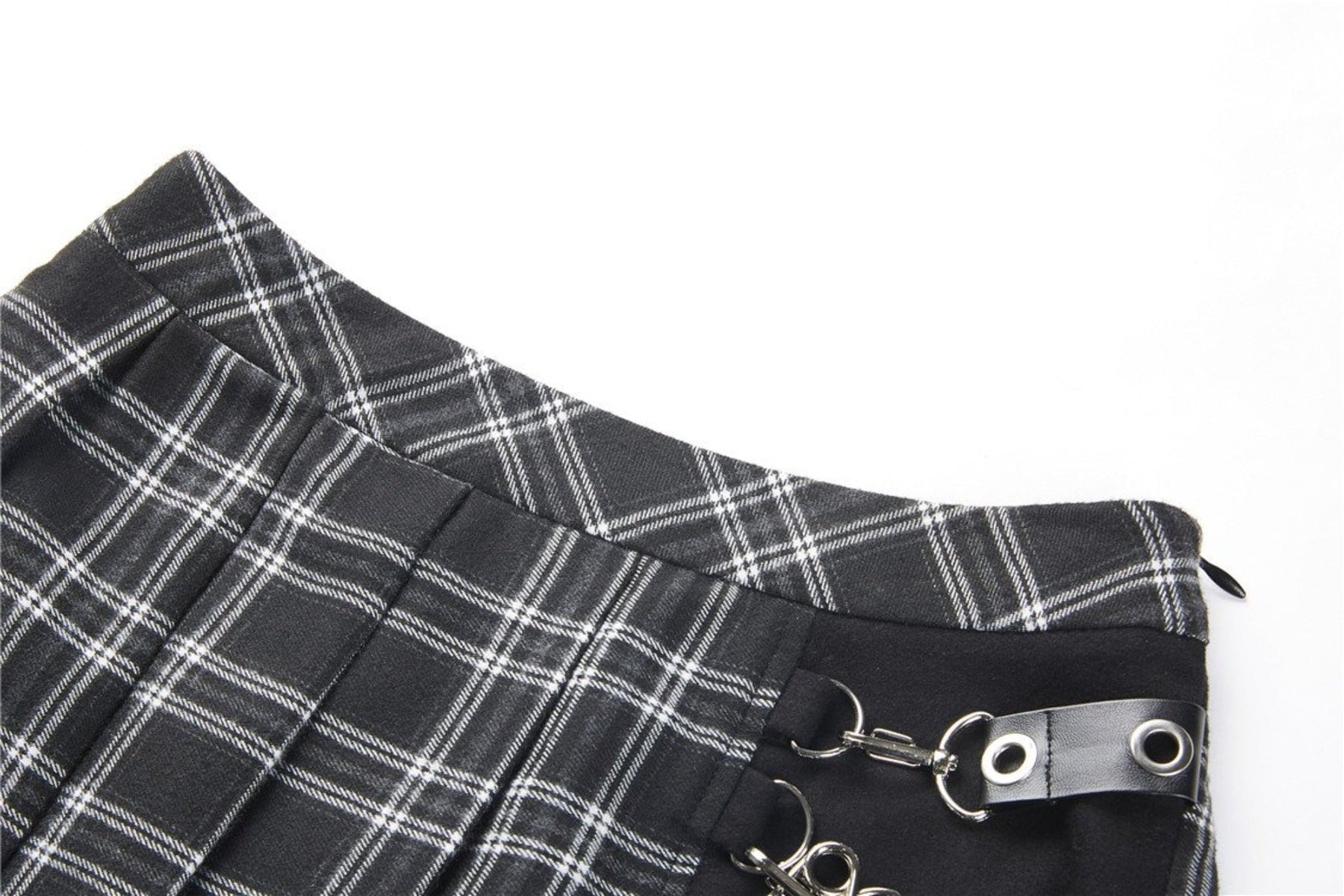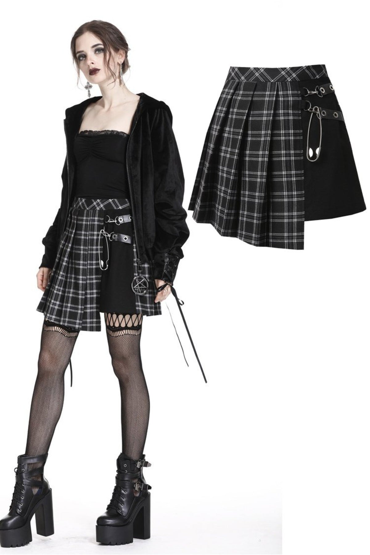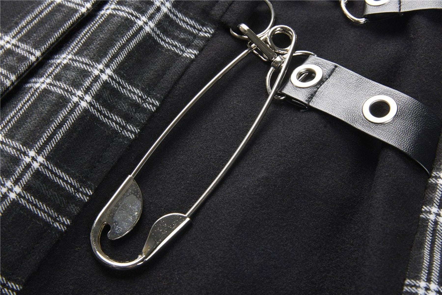 An asymmetric tartan pleated layer, over black fabric with two riveted ring straps and an oversized safety pin.