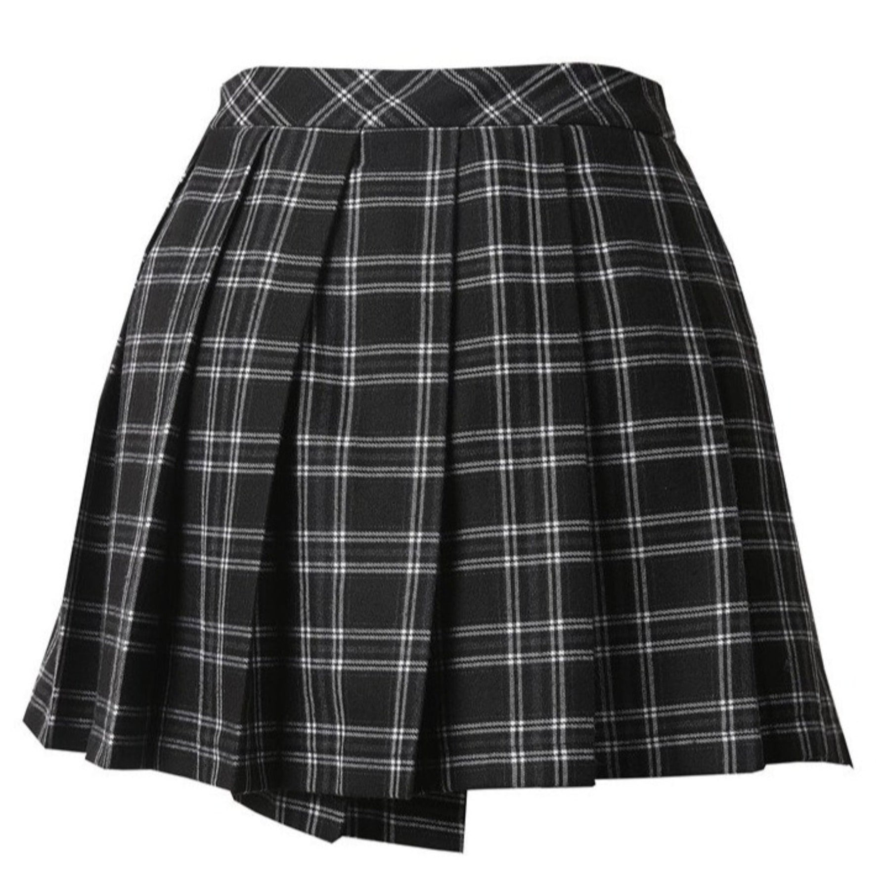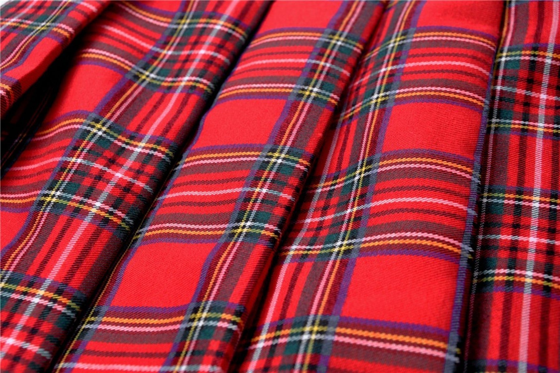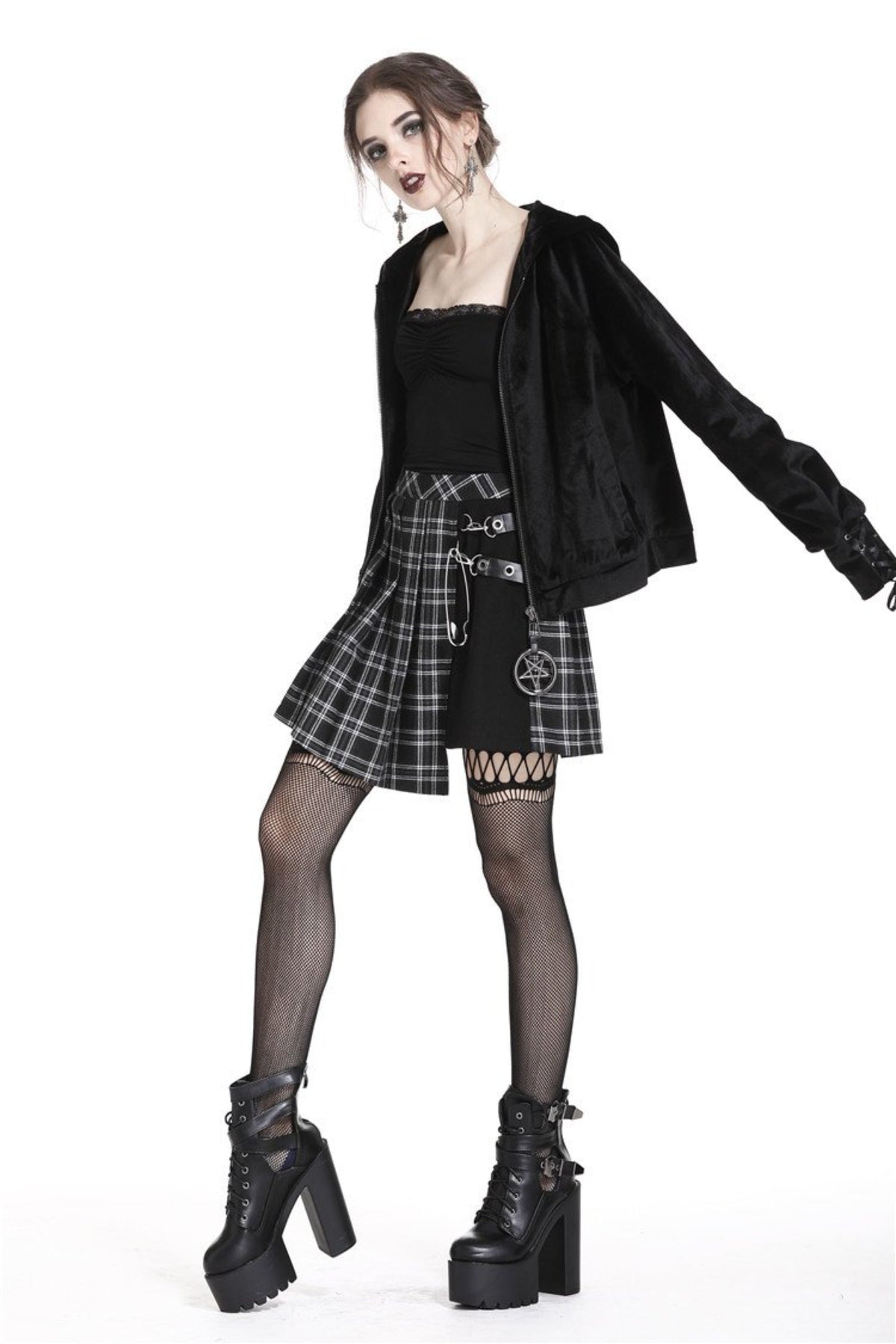 An asymmetric tartan pleated layer, over black fabric with two riveted ring straps and an oversized safety pin.