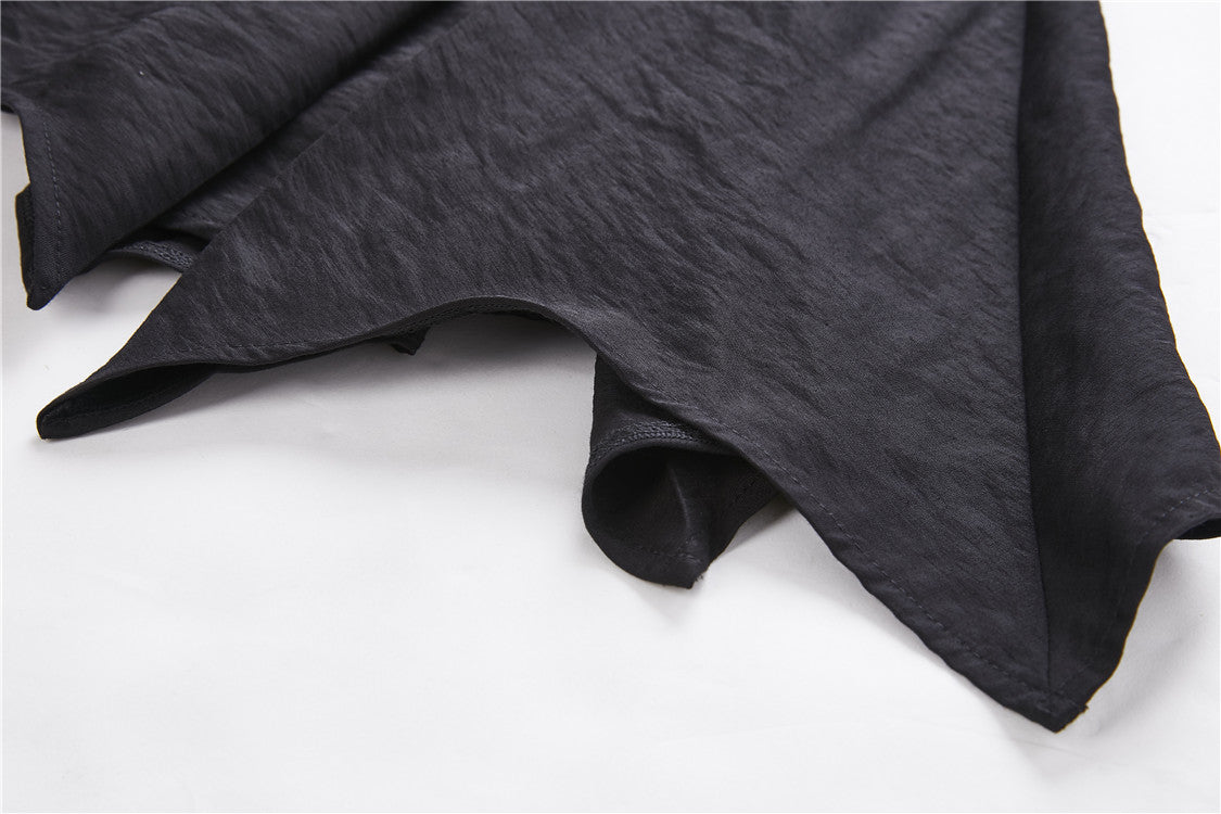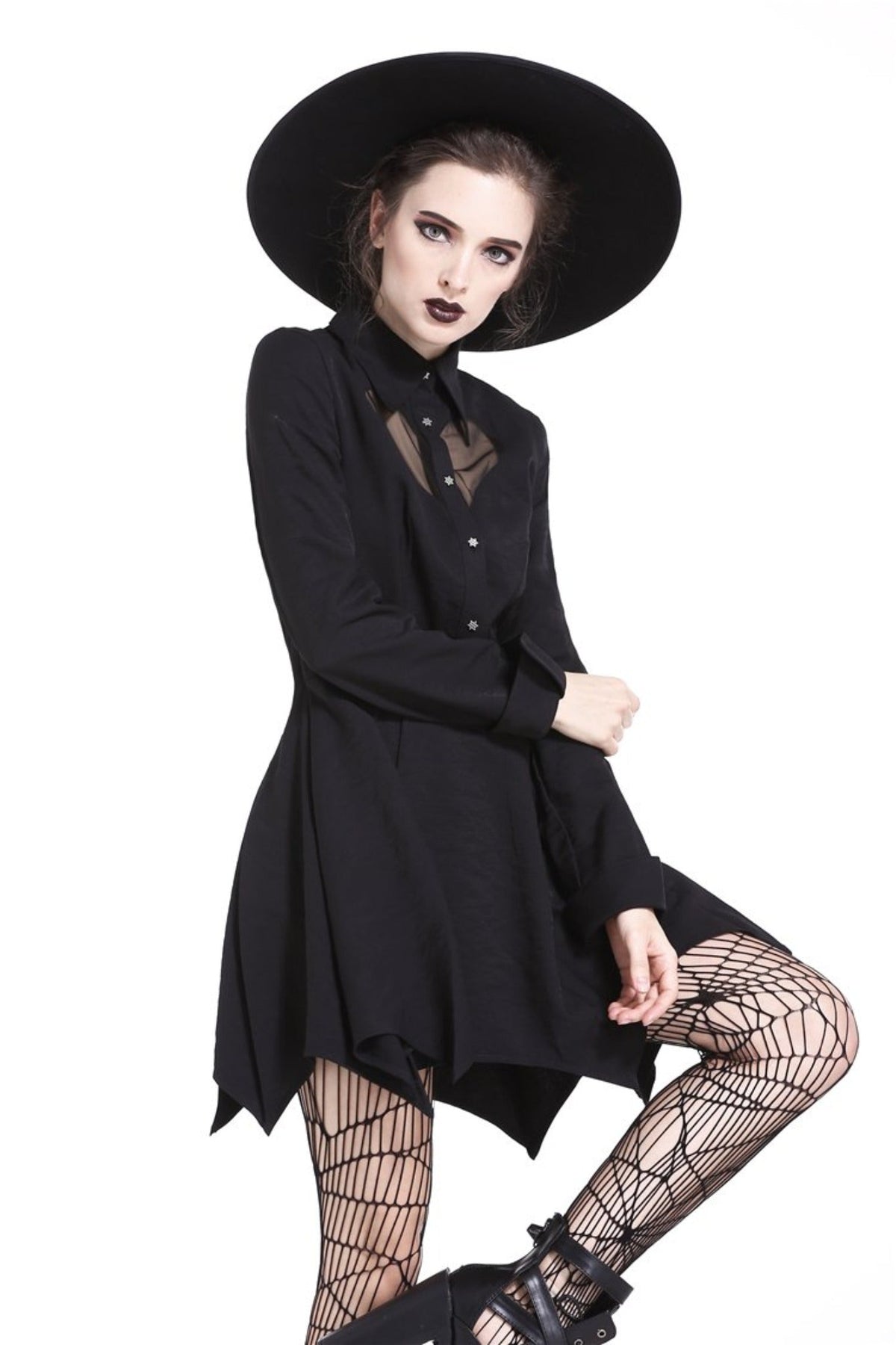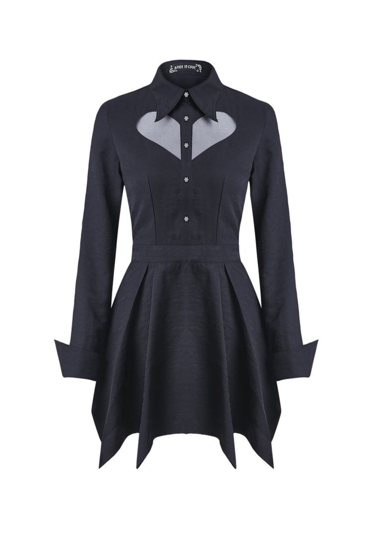 The ultimate bat-style Goth mini dress with a sheer heart cut-out chest design and the coolest pointy cuffs, collar and hem.