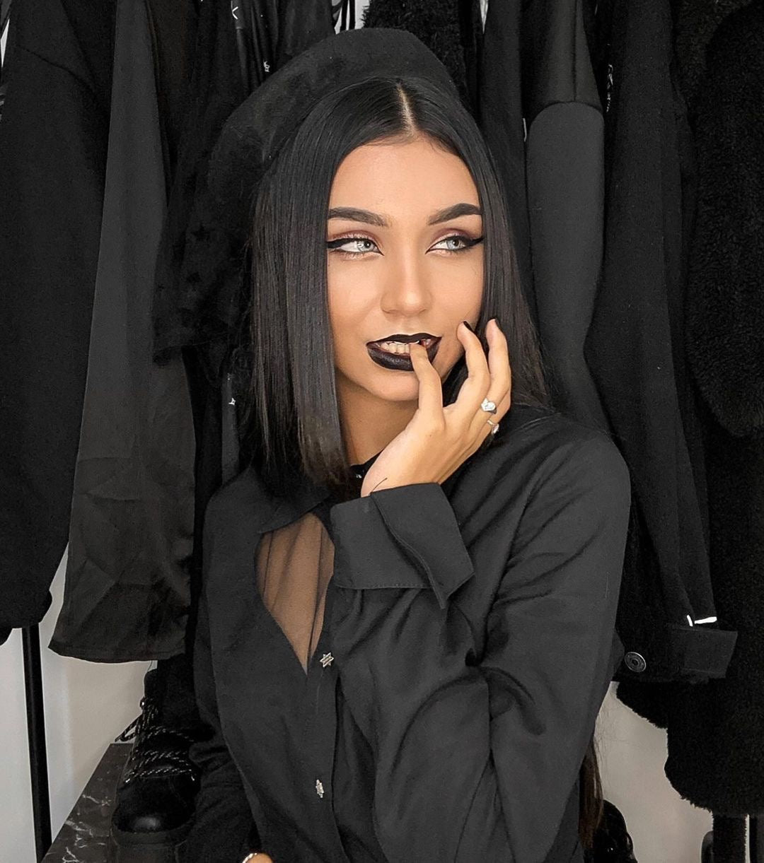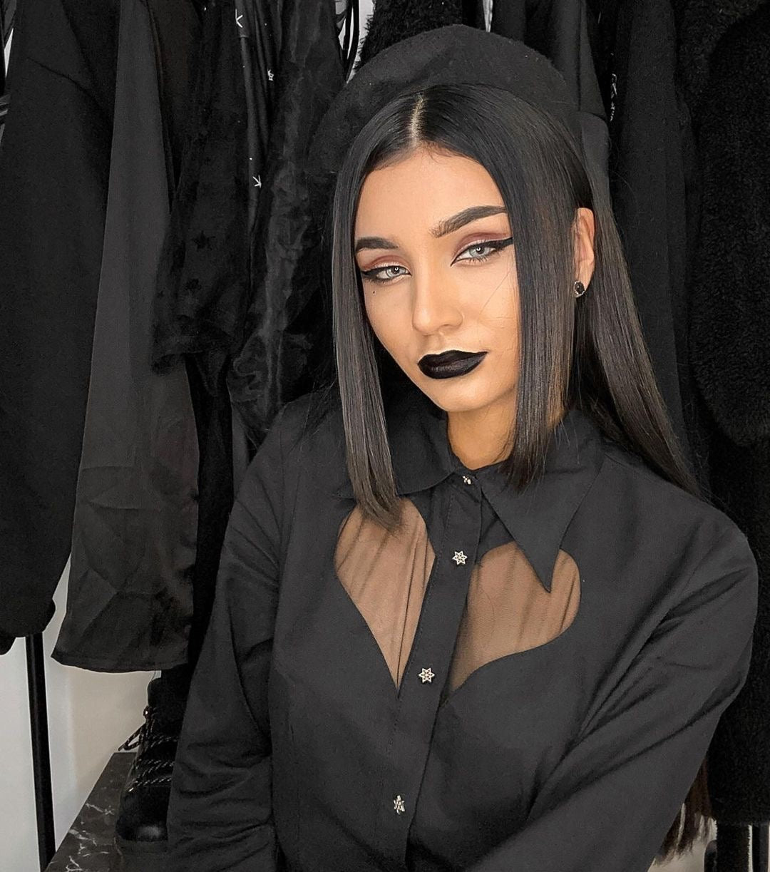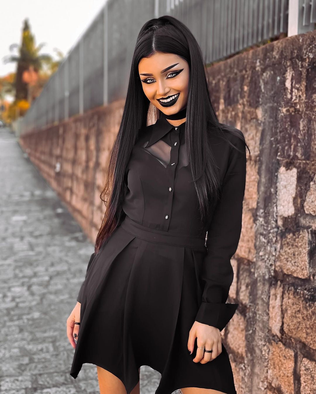 The ultimate bat-style Goth mini dress with a sheer heart cut-out chest design and the coolest pointy cuffs, collar and hem.