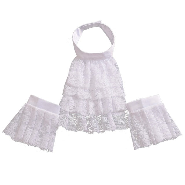 A must-have Vampire accessory set consisting of a ruffled collar and cuffs to accentuate any vintage outfit.